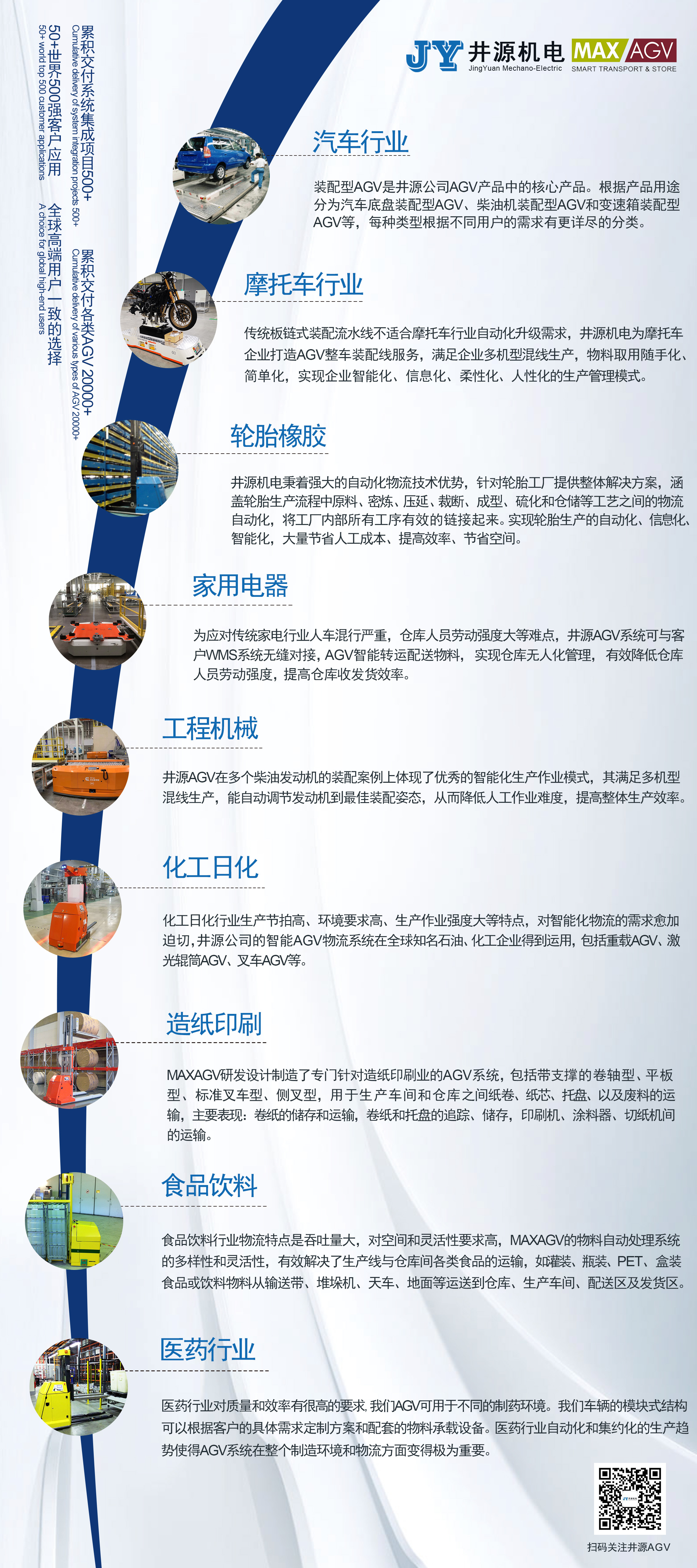 為應對不同行業物料的轉運需求,井源近19年來,通過不斷地優化、調整機械設計,提升功能性運用,來適配用戶智能化升級改造規劃。豐富的產品種類,已廣泛服務于汽車、摩托車、輪胎、工程機械、家用電器、食品飲料、化工日化、造紙印刷等眾多行業,滿足其不同物料、不同載具的轉運工作。